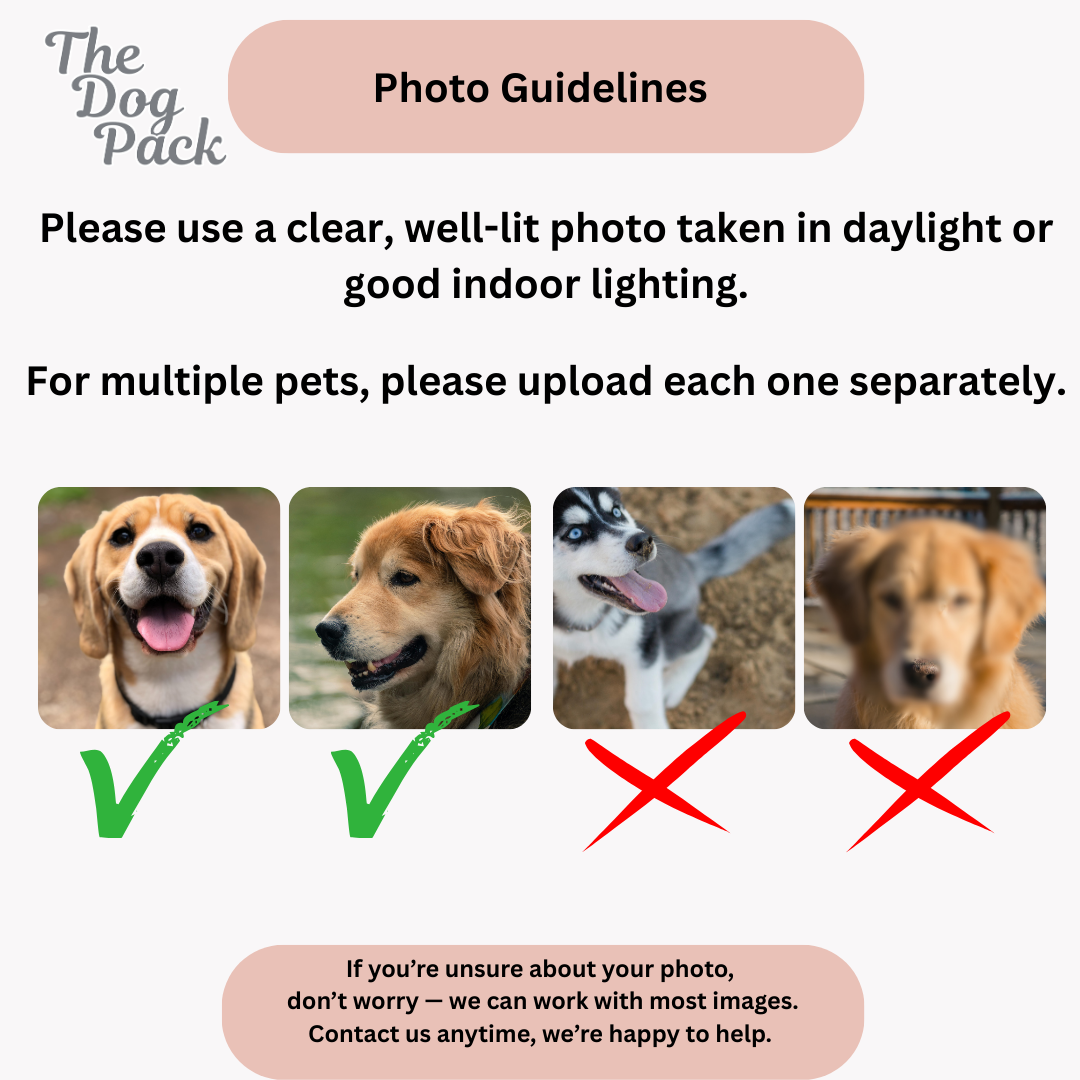 Please upload 3 clear photos of your dog and enter the name exactly as you’d like it printed.